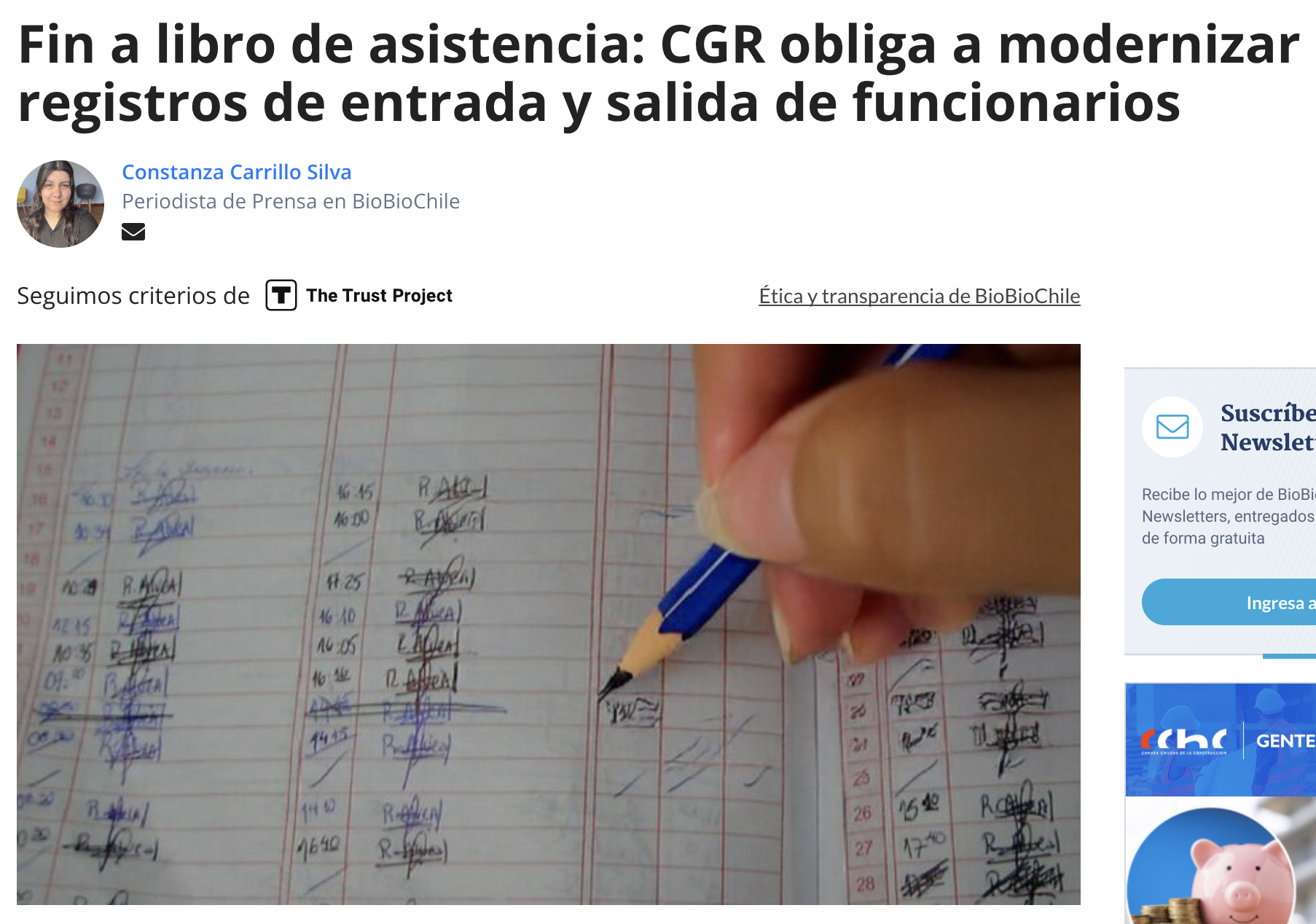 El medio BioBio publicó la nota “Fin a libro de asistencia: CGR obliga a modernizar registros de entrada y salida de funcionarios”, en la que se informa que la Contraloría General de la República (CGR) instruyó a los organismos públicos a reemplazar los libros de papel por sistemas tecnológicos como tarjetas electrónicas, softwares en línea o sistemas biométricos, con un plazo máximo hasta el primer semestre de 2026.