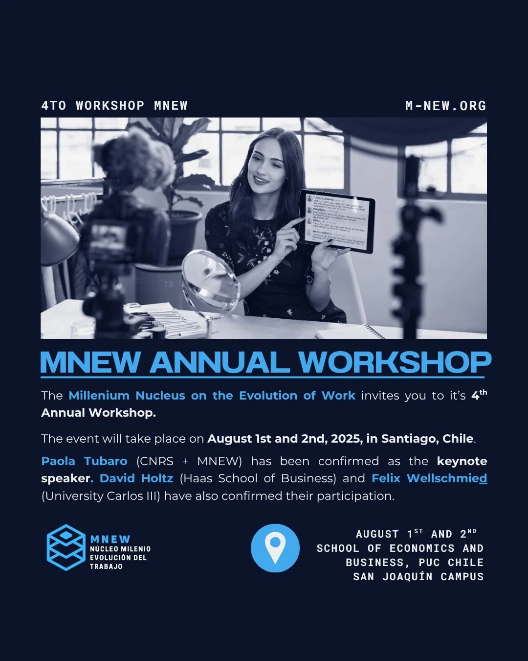 El Núcleo Milenio sobre la Evolución del Trabajo (M-NEW) invita a su 4º Workshop Anual, que se llevará a cabo los días 1 y 2 de agosto de 2025 en la Facultad de Economía y Administración de la Pontificia Universidad Católica de Chile. Este evento continúa consolidándose como un espacio clave para reflexionar sobre las transformaciones tecnológicas, las dinámicas laborales y los retos regulatorios que reconfiguran el trabajo hoy y hacia el futuro.