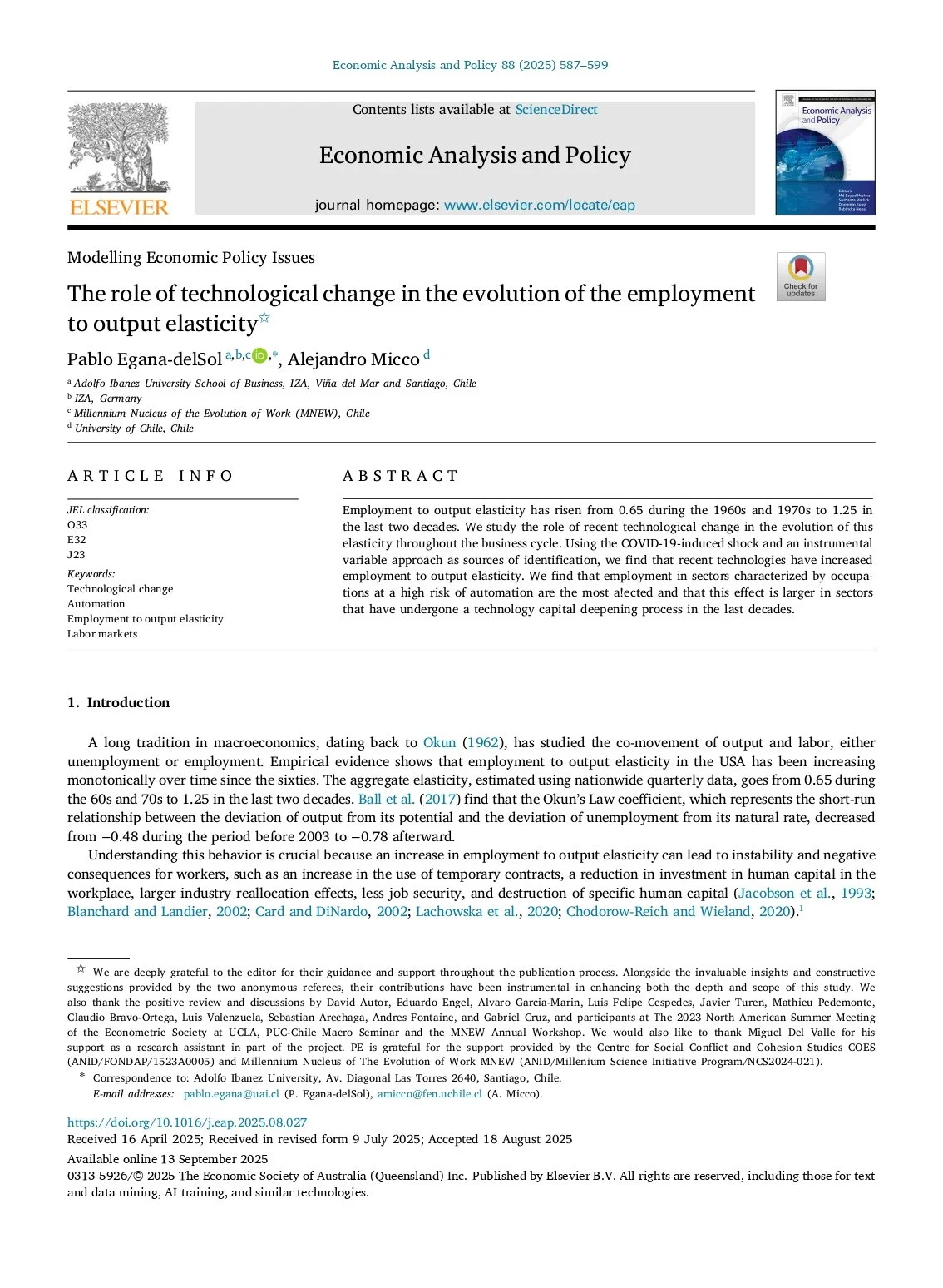 El investigador principal del Núcleo Milenio sobre la Evolución del Trabajo (MNEW), Pablo Egaña del Sol, junto a Alejandro Micco, publicó el estudio “The role of technological change in the evolution of the employment to output elasticity”.