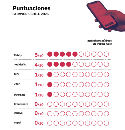 El informe “Fairwork Chile 2025: Estándares laborales en la economía de plataformas” evaluó ocho plataformas: Cabify, PedidosYa, DiDi, Uber, Uber Eats, Cronoshare, inDrive y Rappi, bajo cinco principios que miden aspectos clave del trabajo: pago justo, condiciones justas, contratos justos, gestión justa y representación justa, con un puntaje máximo de 10 puntos.